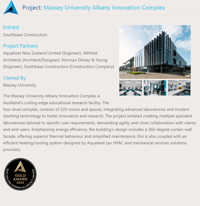 The Massey University Albany Innovation Complex has picked up a gold award at the NZ Commercial Project Awards.